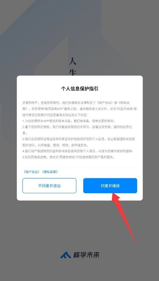 当应用第一次启动时,系统会弹出用户协议界面,你需要仔细阅读协议内容,之后点击“同意并继续”按钮,这样就能进入到下一步操作了。