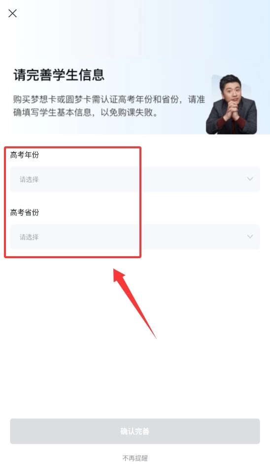 登录后需要完善学生的个人信息,其中包含年级、学科这类与学习相关的数据,这样才能获取到个性化的教育内容。