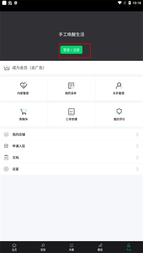 点击个人,接着点击登录注册选项将其打开,再点击页面底部的发现按钮。
