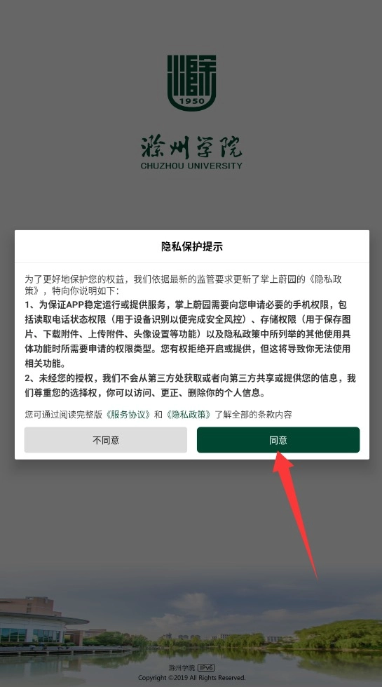 当你第一次打开应用时,会看到隐私协议的条款内容,需要仔细阅读后点击“同意并继续”按钮,这样才能进入登录界面。
