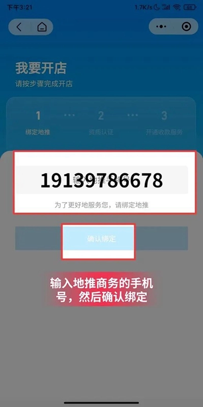 输入地推商务手机号后点击“确认绑定”(没有地推商户手机号的话,是无法完成入驻的哦)