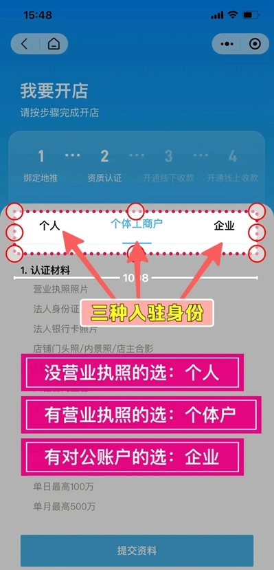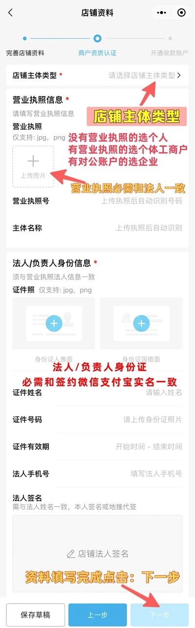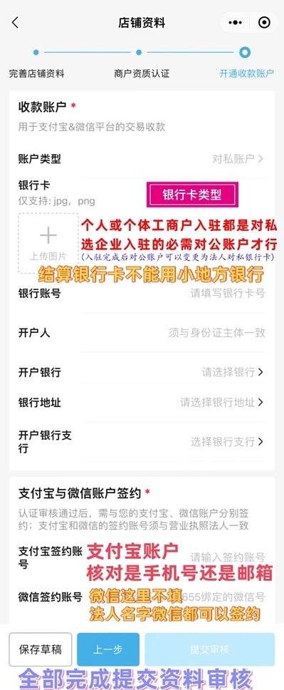 商户资质认证:要选择入驻方式,如果你没有营业执照就选个人方式入驻,如果是个体户选择个体工商户入驻,你是企业有对公账号就选企业【企业用对公账号入驻成功后可以变更为法人的私人银行卡收款,修改路径:开店通首页——收款账户——修改账户 】,各种入驻方式都需要认证用的微信、支付宝与法人经营者是同一名下的才能成功【公司营业执照入驻需要用到企业支付宝,个人和个体户不需要】