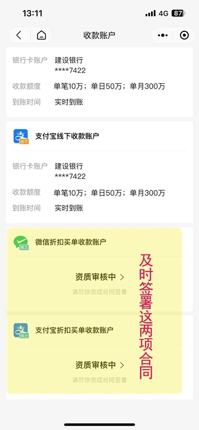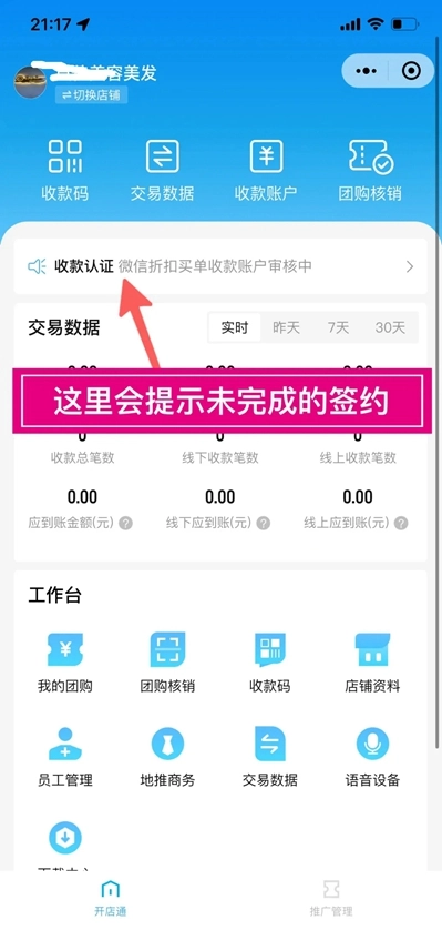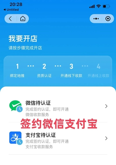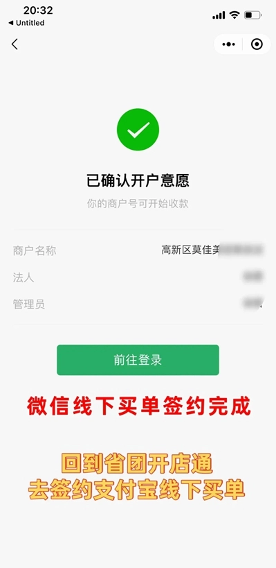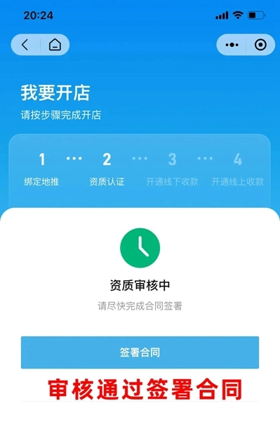 第一个签约完成后,回到省团开店通查看审核进度,确认微信与支付宝的线下收款签约审核状态。