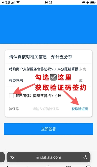 第一条短信链接的签约界面,勾选——获取验证码——立即签署