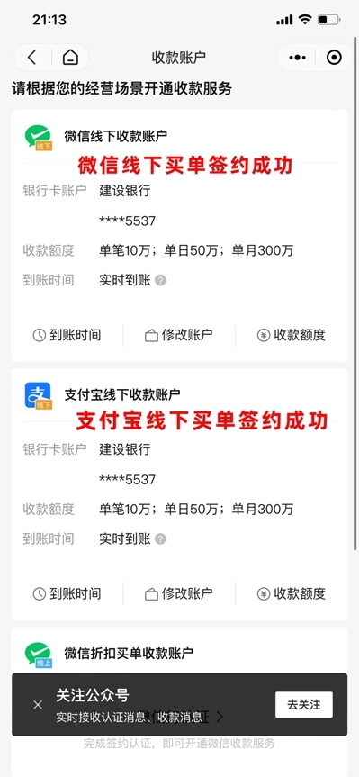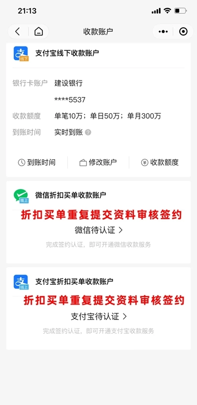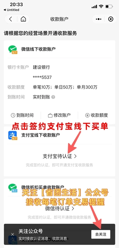 签约折扣买单的话,点击“微信待认证”和“支付宝待认证”这两个选项去完成签约操作。