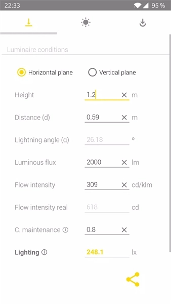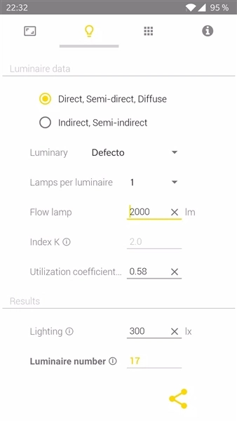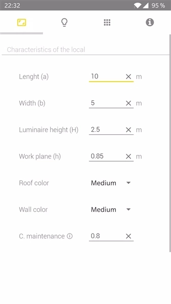 2、以计算房间照度为例,需输入房间的长、宽、高,以及灯具数量和光通量等关键数据,这些信息可在灯具的包装或说明书上查询到。