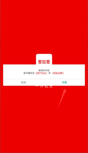 1、首次启动客拉客商城时,系统会显示用户协议与隐私条款,仔细阅读后点击同意进入主界面。