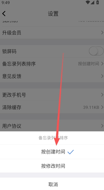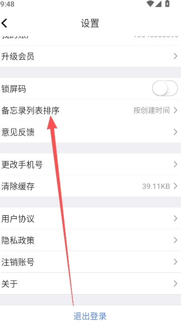 1、点击便签备忘录设置功能选项,下滑页面到底部选择备忘录列表排序。