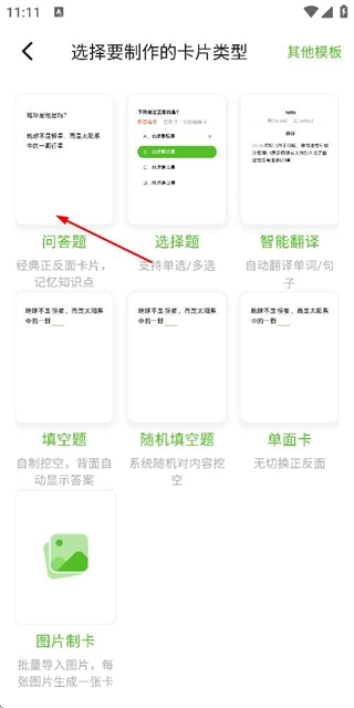 3、在卡片类型选择页面点击问答题类型,进入问答题的编辑页面。
