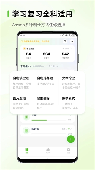 Anymo是一款实用性极强的记忆管理工具,以记忆卡正反面记录、多分组模式为核心优势,操作简洁便捷,支持随时随地记录与回顾,贴合记忆规律的设计助力长期记忆,适配多元场景需求,无论是学习备考还是工作生活,都能帮助用户高效管理信息、强化记忆,是提升记忆效率的优质选择。