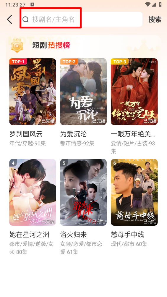 支持点击搜索框,输入剧名或主角名进行搜索。