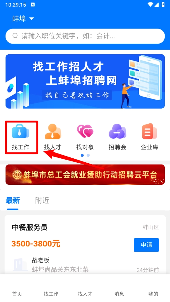如图所示,点击"找工作"进入。
