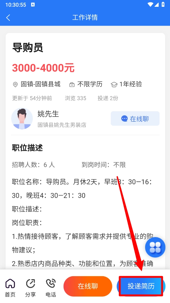 在工作详情页点击"投递简历"。