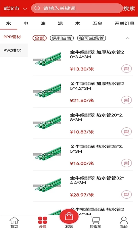 在分类列表里挑选对应的品类,浏览水管电线、水泥沙、防水涂料之类的配件,点击目标配件就能查看参数、价格以及正品保障的相关信息。
