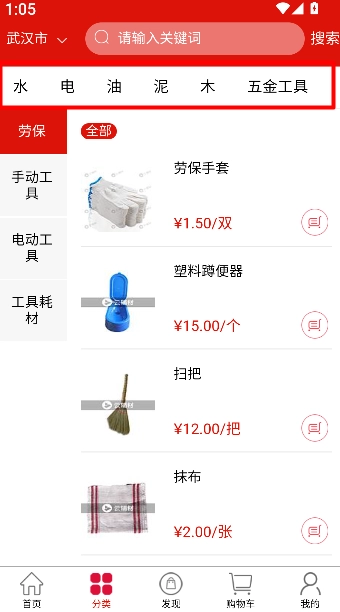 打开《云辅材》软件进入首页后,在功能导航区域找到 “产品分类” 板块,点击进入后可查看水工、电工、五金等细分品类。