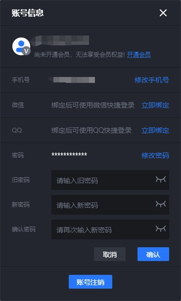 用户可在个人中心的账号信息弹窗里,输入旧密码与新密码来完成密码重置操作。