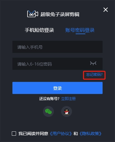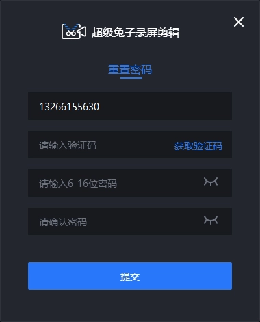 在密码登录的弹窗里,点击“忘记密码?”选项,就能打开重置密码的弹窗。接着输入该账号对应的手机号、新设置的密码以及验证码,最后点击提交按钮,就能完成账号密码的重置操作。