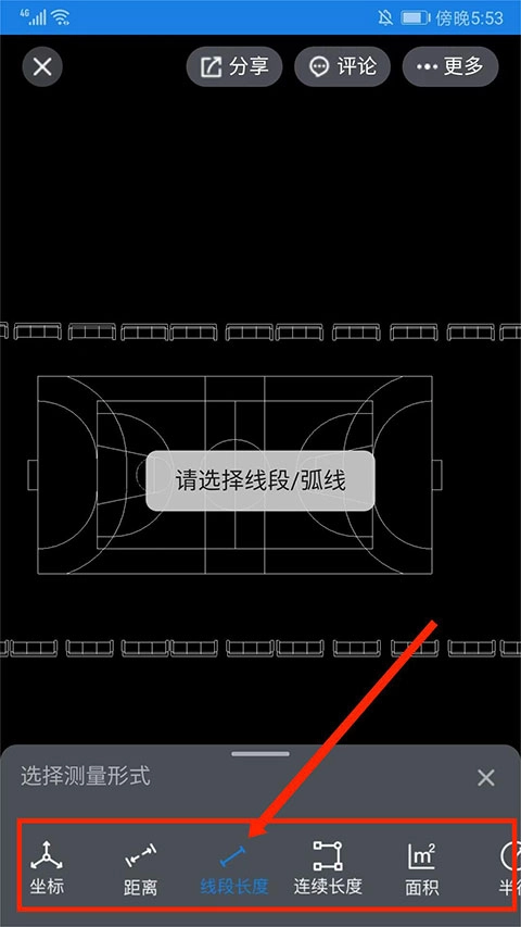 5、支持测量“坐标”、“距离”、“线段长度”、“连续长度”、“面积”、“半径”等数据,这里以“线段长度”为例,