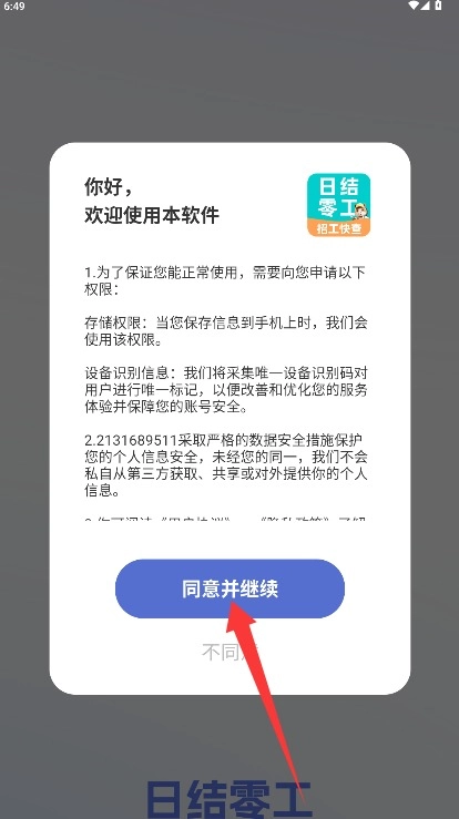 1、首次使用时,请仔细阅读用户协议和隐私政策,确认内容无误后,点击“同意并继续”按钮即可进入。