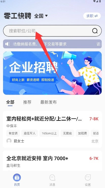 3、进入首页后,可浏览系统推荐的日结岗位信息,也能借助搜索功能查找附近的零工招聘信息。