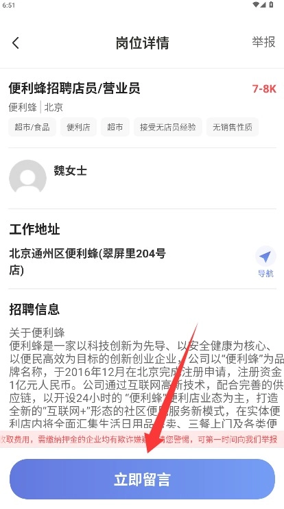 4、浏览岗位详情里的工作地点与具体要求,点击“立即沟通”按钮就能联系雇主进行咨询。