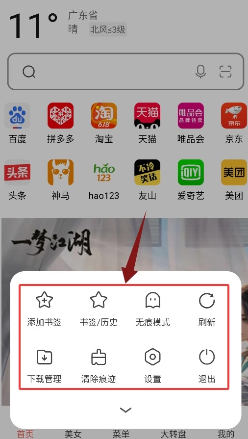 3、菜单界面具备添加书签、查看历史记录、开启无痕模式以及进行管理操作的功能。