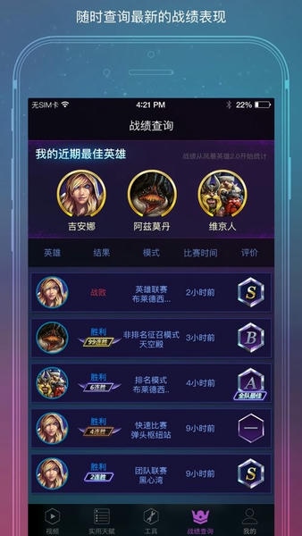 随身风暴英雄官方版是一款由风暴英雄官方出版的游戏辅助工具。利用这款工具,你可以查看完整的游戏资料、过往战绩、天赋攻略等,还提供互动聊天平台,用户可以在这个平台上发表自己的观点,寻找更多志同道合的小伙伴。