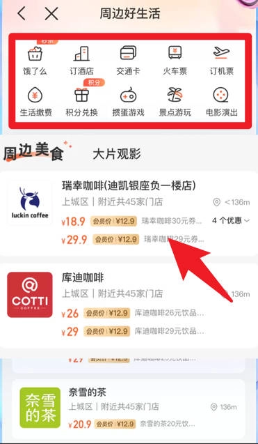 4、周边好生活页面集成了美食、酒店、交通卡、票务、生活缴费以及积分兑换等多元服务,助力用户轻松畅享本地的吃喝玩乐与各类便民生活体验。