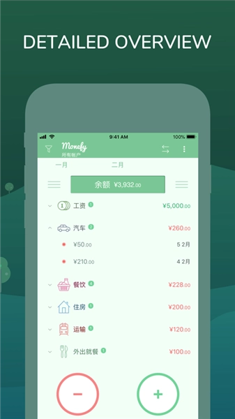 3.在整洁且信息丰富的图表上查看您的支出分配情况,或者从记录列表中获取详细信息