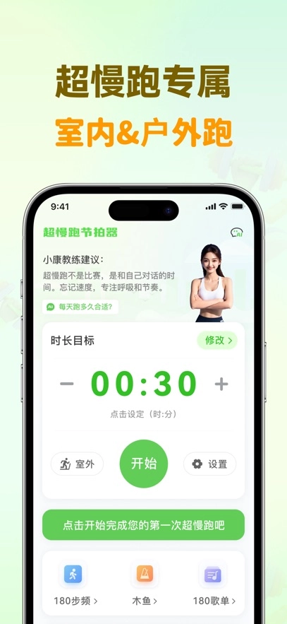 每天设定一个小目标,规划好锻炼时段,就能开启超慢跑计时器,还能定时提醒哦!