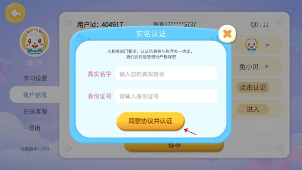 4、填写家长的姓名与身份证号后,点击下方的“同意协议并认证”按钮,即可完成认证。