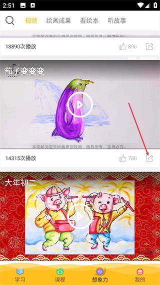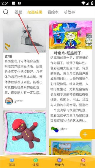 2、在【想象力】页面,点击顶部的【视频】标签,切换至视频列表页面。