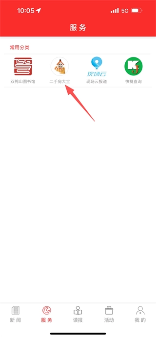 2、进入服务页面后,找到并点击“二手房大全”选项,即可进入二手房大全页面。