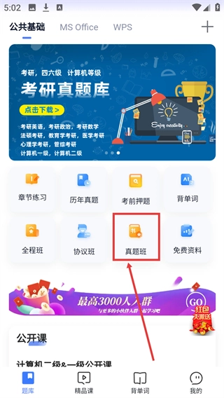 1、在【题库】页面,找到【真题班】选项并点击,可进入课程页面查看各类题库课程。