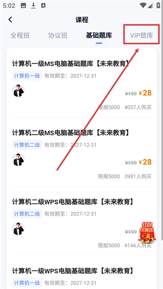 2、进入课程页面后,找到顶部的【VIP题库】标签并点击,可切换至VIP题库分类查看对应的课程内容。