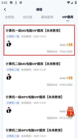 3、在【VIP题库】分类下,找到【计算机一级MS电脑VIP题库【未来教育】】课程条目,点击可进入详情页。
