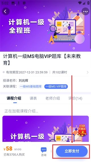 4、进入该课程详情页后,查看课程信息,点击底部的【立即支付】按钮,即可完成该VIP题库课程的购买。