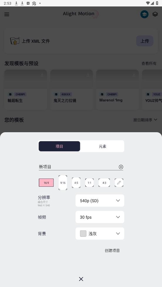1. 安装好Axcven剪辑后,打开该软件,点击首页中间的加号按钮新建项目,接着根据自身实际需求,对项目的名字、比例、分辨率、帧率以及背景进行设置。