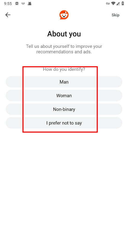4、点确定进入到下一步,可以直接点右上角skip跳过就行,不用挨个去选择性别或是其他项。