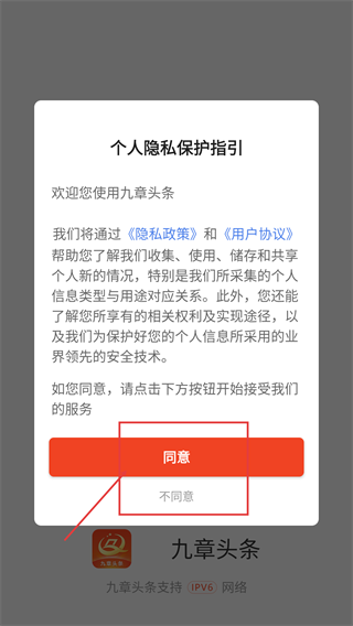 1、进入【九章头条】后,需先对【个人隐私保护指引】弹窗进行处理,点击【同意】按钮,就能继续使用该平台的资讯服务功能。