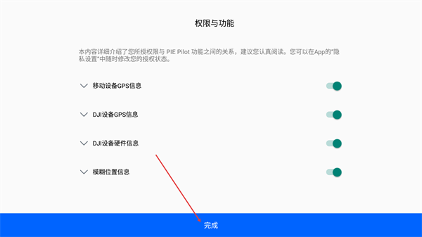 3、进入【权限与功能】页面后,检查【移动设备GPS信息】等各项权限是否已开启,确认无误后点击【完成】按钮,即可完成权限配置。