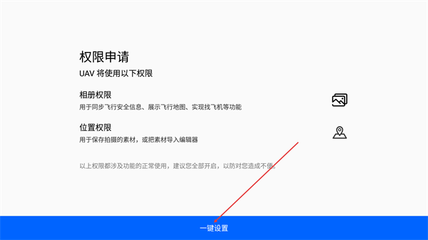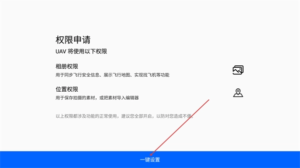2、进入【权限申请】页面后,可查看【相册权限】与【位置权限】的用途说明,点击【一键设置】按钮即可快速开启所需的权限。