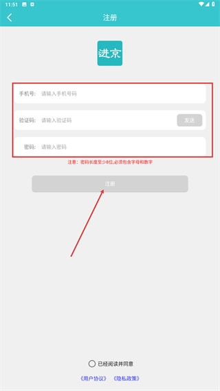 4、注册操作步骤如下:先填写【请输入手机号码】栏,接着获取并输入验证码,再设置满足要求的密码,勾选相关协议后点击【注册】按钮即可。