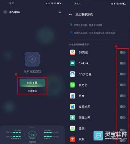 2、第一次打开,我们需要先添加游戏,如果手机里还没游戏,点击“前往”,如果已经有游戏的话,点击下方“手动添加”,打开对应游戏后的开关就可以添加了。