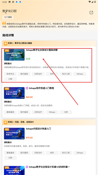 3、进入数字化口腔路线详情页面后,点击阶段1下方的【3shape数字化支架设计基础讲解】课程,查看该课程的重点内容及相关标签。