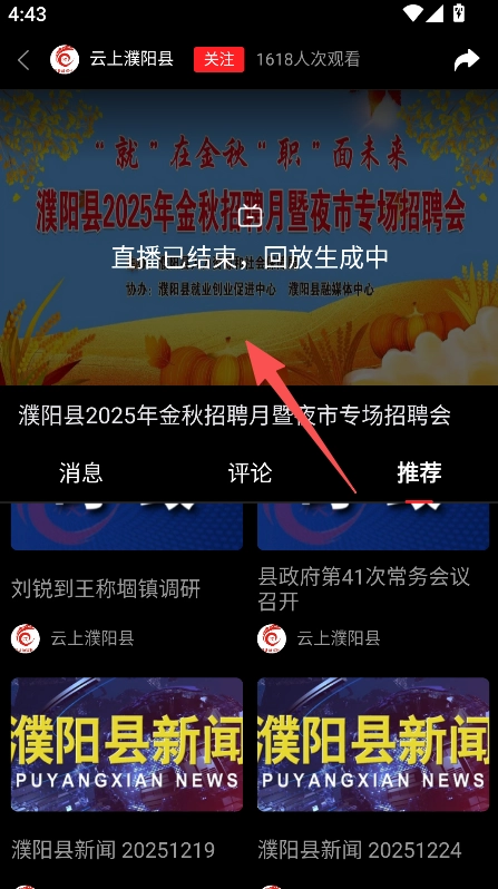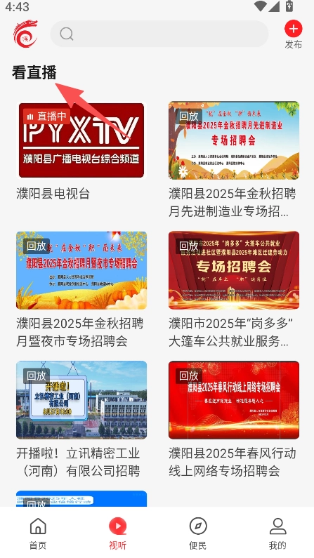 2、整合直播与回放资源,涵盖招聘会电视台直播等内容,集中展示本土活动信息,满足本地场景下的内容获取需求。