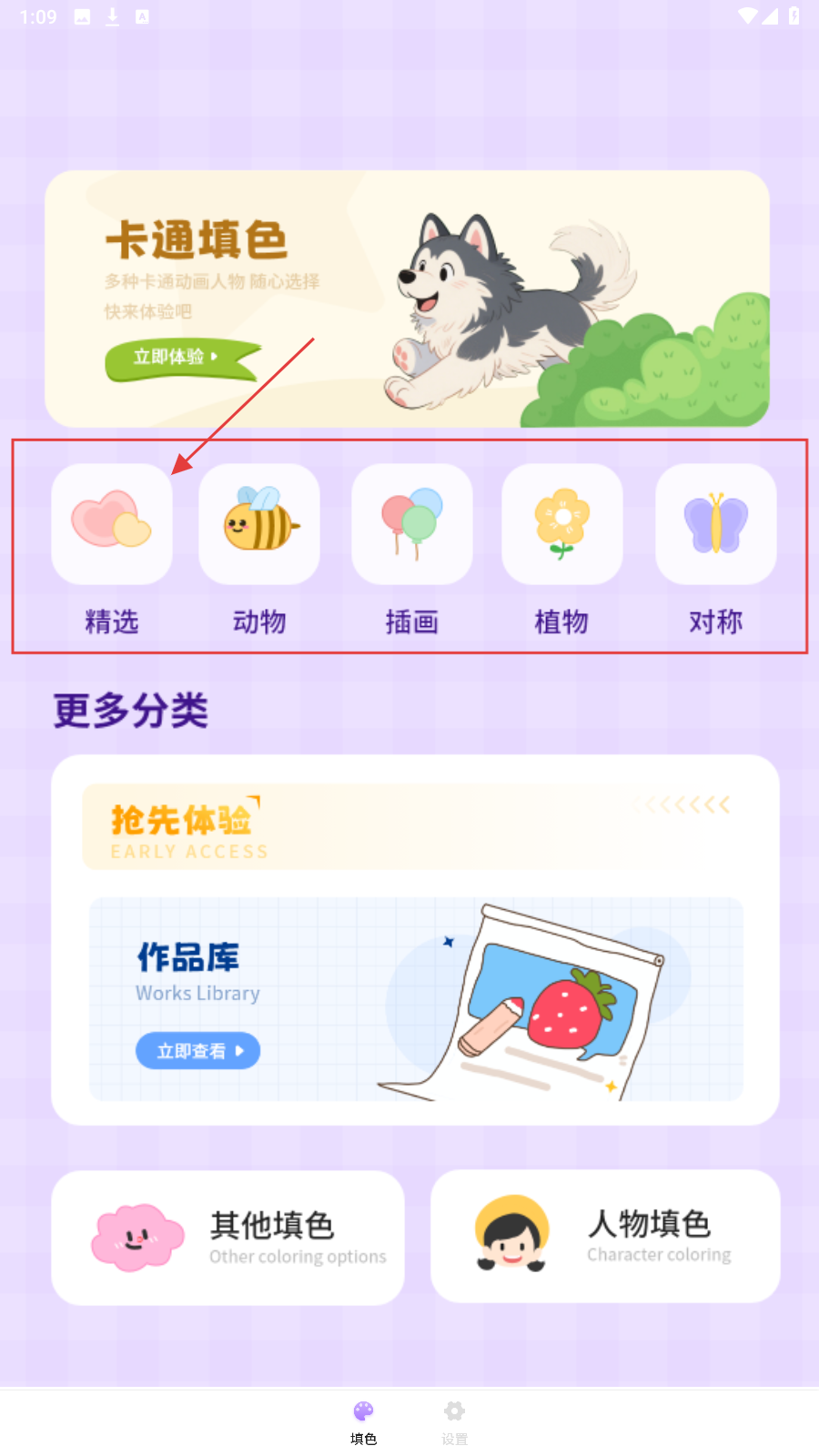 1、打开应用,点【精选】分类,进入主题填色区,开启卡通填色体验。
