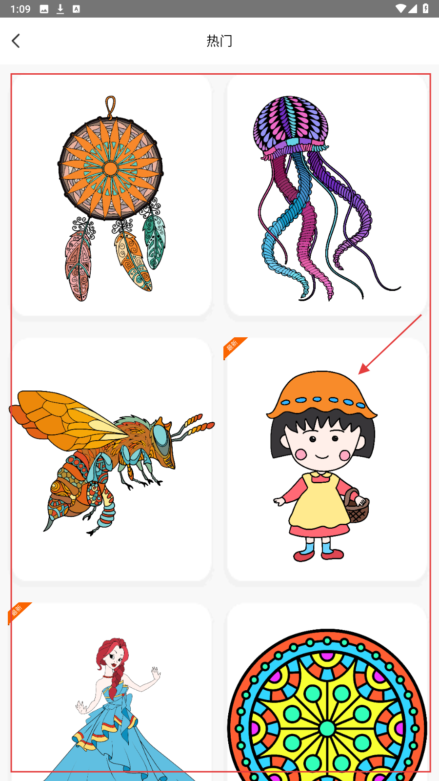 2、在【热门】图案页,选喜欢的卡通形象,如戴帽女孩,进入填色界面。