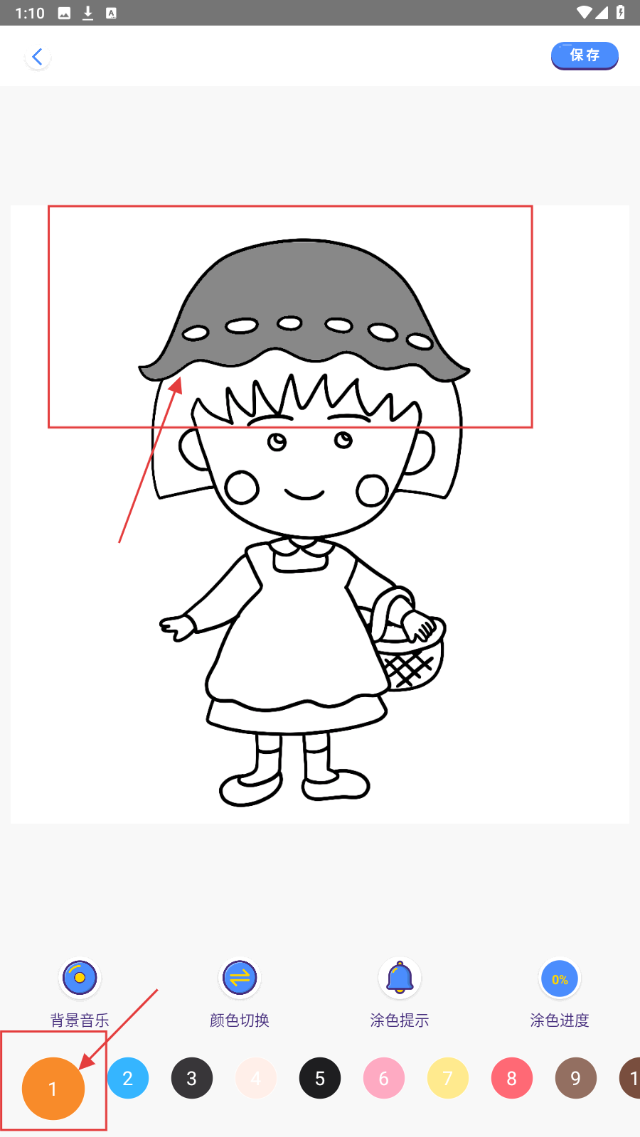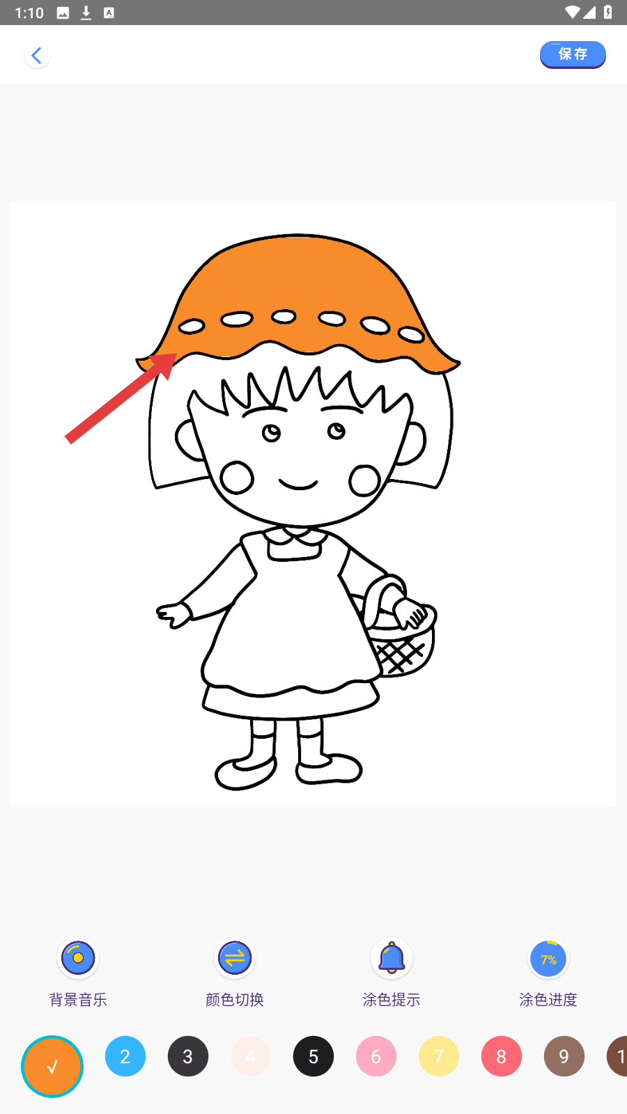 4、用选好的颜色完成帽子填色,可切换颜色继续,填完后点【保存】作品。