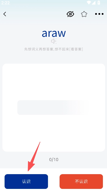 3、进入词汇学习界面后,依据自身实际情况点击“认识”或“不认识”按钮。